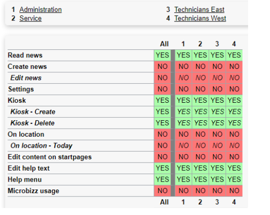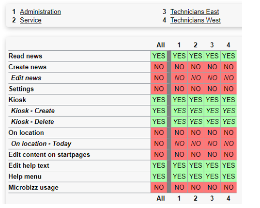 • Microbizz usage: Allows you to specify who has the permission to administer the usage section of Start (CONFIGURATION > USAGE)