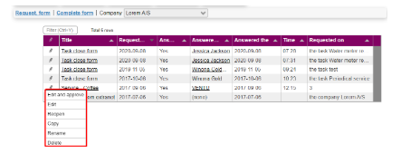 Notice that forms filled out on a task (or equipment etc.) will be listed amongst the form answers for the task's company; however this doesn't apply to forms that were requested on the task (or equipment).