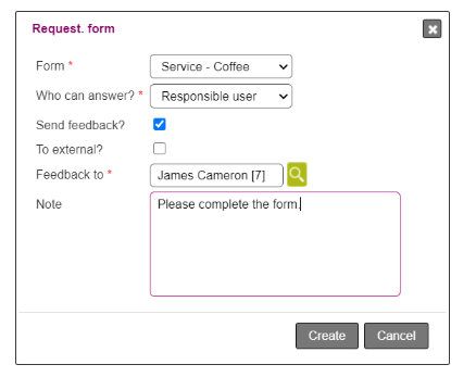 - To external?: This option will let you send the form to a person rather than a user. The feedback to field will only be able to search for persons. By pressing Create, the form will be send through a mail
