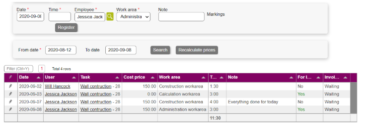 - Work area: The type of work done within the time registration