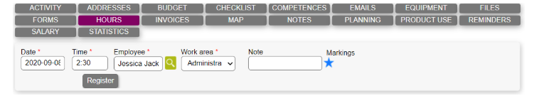 - Markings: Stars markings used to give special meanings to the registrations. This can be configured in the hours module general setting