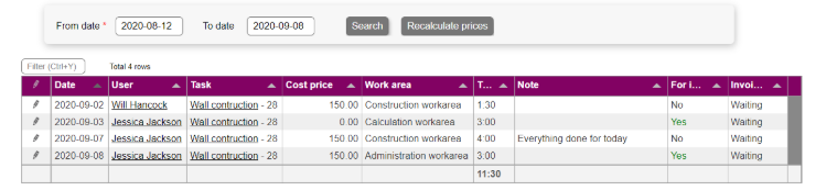 If hourly prices have been adjusted since the registrations have been created, it's possible to press recalculate prices which will update all registrations to the newly updated prices.