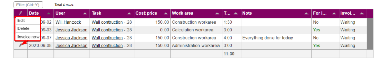 - Invoice now: Send one specific time registration to be invoiced
