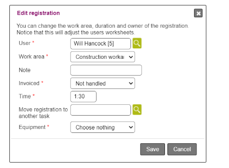 - Move time registration to another task: Move the selected registration from this task to another (only if registration is on a task)