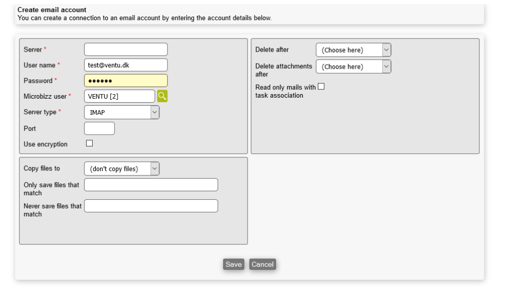 - Microbizz user: Choose which MicroBizz-user you want this new email import to be attached to