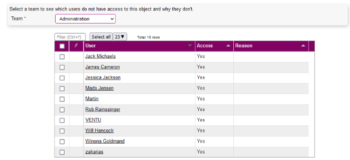 Object access Here you can see the users of any team who does and doesn't have access to the company, and why.