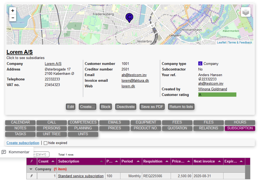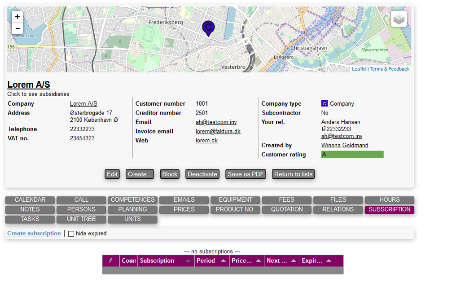 Creating a new subscription is done by accessing the subscription tab directly on a company main card.