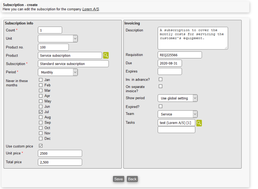 As seen above the creation of a subscription is divided in two sections. Info and invoicing.