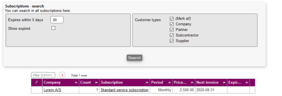 From the search menu, it's possible to invoice on or more subscriptions in advance. This function is used if for any reason the due date of the subscriptions should be moved ahead.