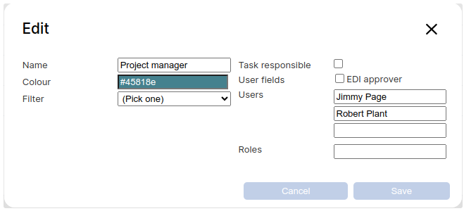 User fields: You can select which user fields on the EDI that controls approval; a user can approve the EDI in this phase if the user is in one of the fields.