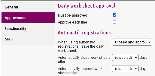 Automatically approve holidays/non-working days: If checked then a worksheet will be approved if it is created because of a registration that was created automatically from a work plan registration on a holiday/non-working day.