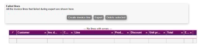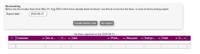 As in the previous section, you can Create invoice line. For more information on this, please refer to it in the beginning of this page. The Re-export button does the same as the Export button i.e. exporting any invoice line you may have selected.