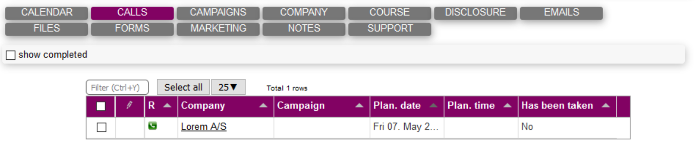 In order to complete calls, you have to make them first. In order to do so, you have to click on the green telephone icon. This will direct you to the call in the Sales module.