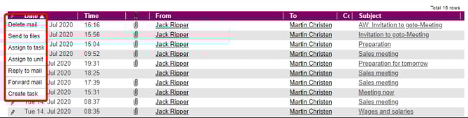 - Send to files: If there are attachments to the mail, they can be added to the files folder for this specific object