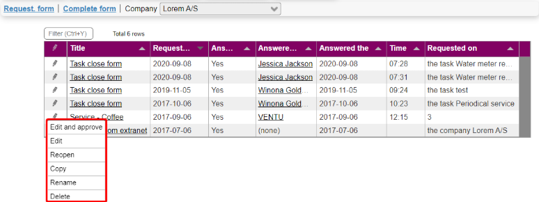 Notice that forms filled out on a task (or equipment etc.) will be listed amongst the form answers for the task's company; however this doesn't apply to forms that were requested on the task (or equipment).