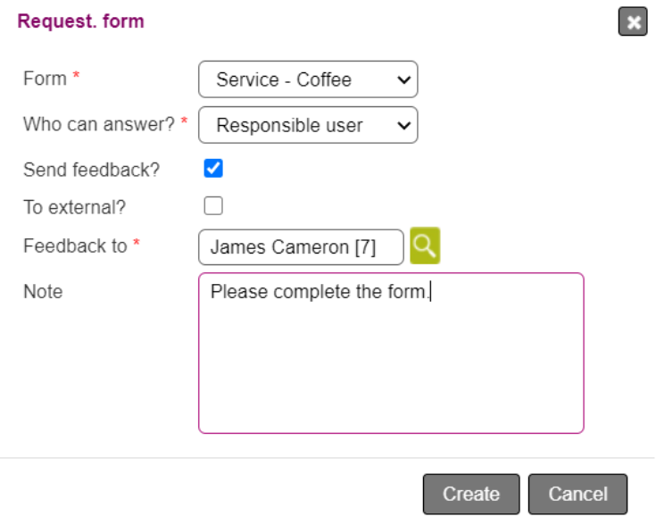 • To external?: This option will let you send the form to a person rather than a user. The feedback to field will only be able to search for persons. By pressing Create, the form will be send through a mail