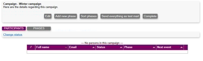 A campaign can have multiple phases, eg. an initial mail and a followup mail. A phase may either simply send a mail, or it may request that the person fills in a form. When the form is filled in, the person advances to the next phase in the campaign.