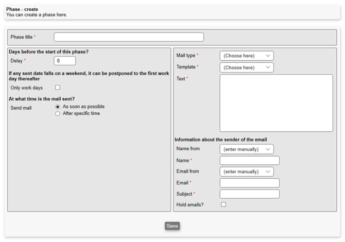 - Delay: Specifies how many days there should be between the previous phase and this one, before this phase begins and the mail is sent.