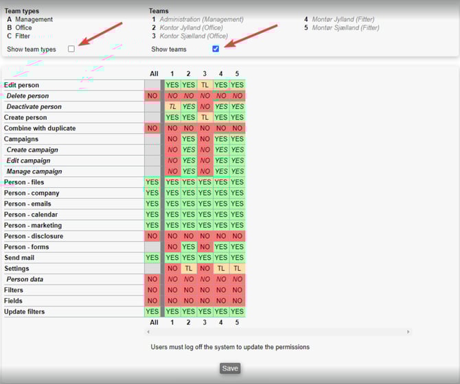 In this module, you can set the permissions for team types and teams by ticking their respective boxes.