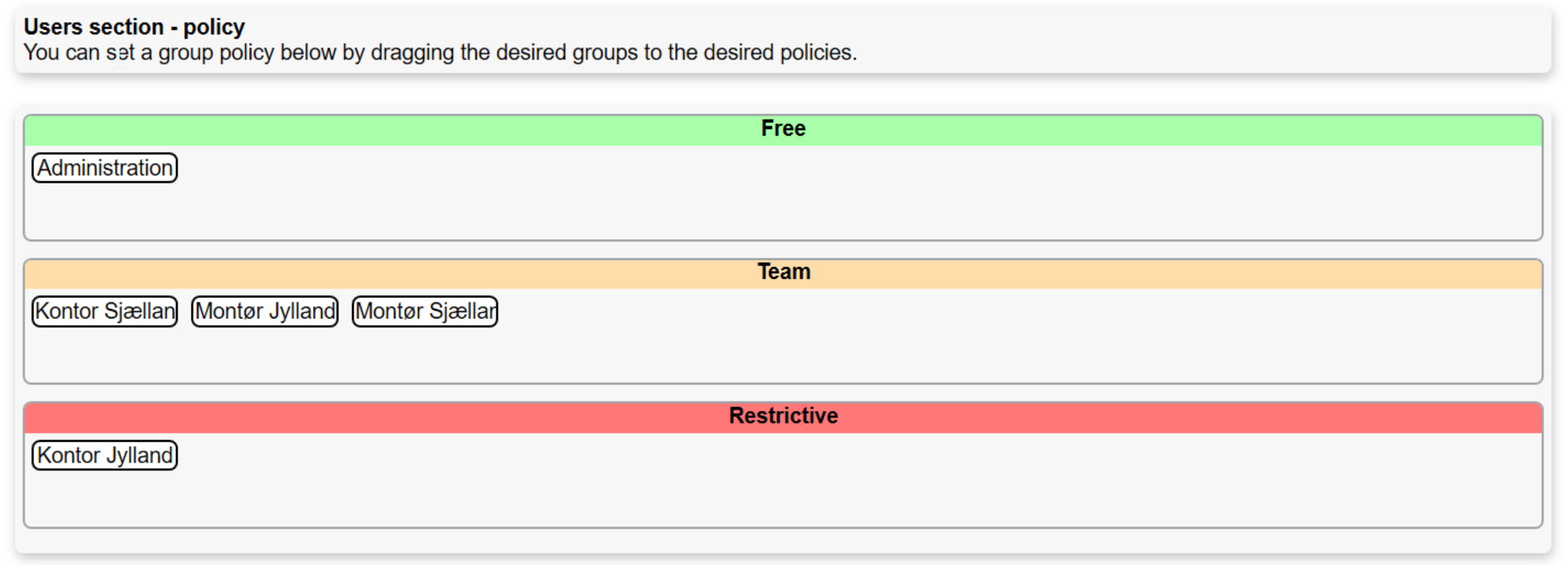 It´s important to note, that policies all are connected to the team level. If you for instance want a specific team to be able to see all tasks in the task module, the team needs to be assigned to the access level: Free. If you only want the team to be able to see tasks related to their specific team, the access needs to be set to: Team.