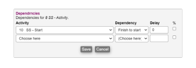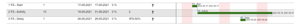 - %: An alternative to the regular delay, stating that the activity can start/finish when a certain % of the dependent activity is passed