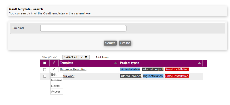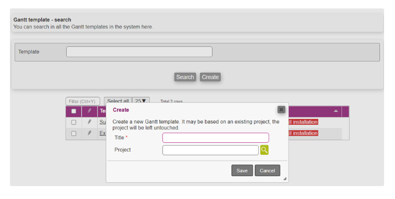 Creating a template is done by accessing the menu GANTT TEMPLATES/SEARCH.