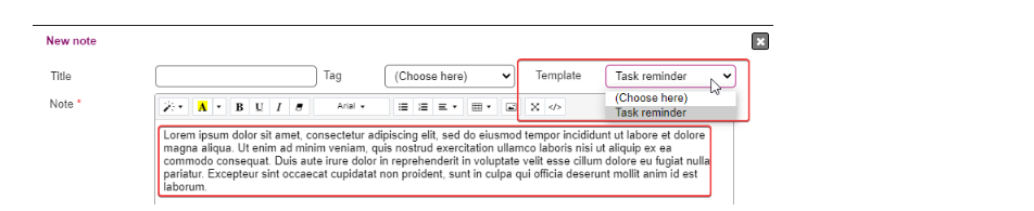 You may pre-fill the note from a template; templates are created in SYSTEM > NOTES > TEMPLATES.