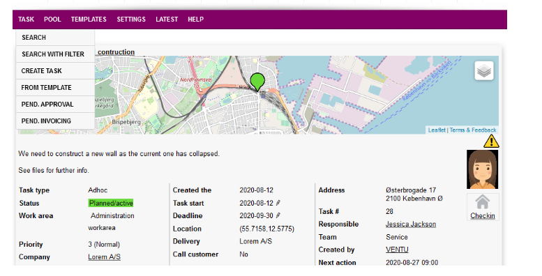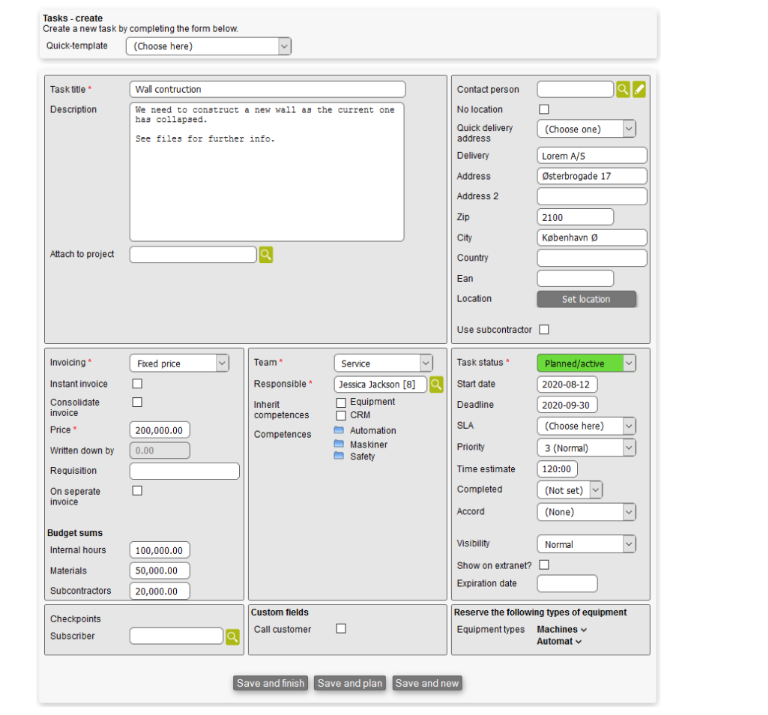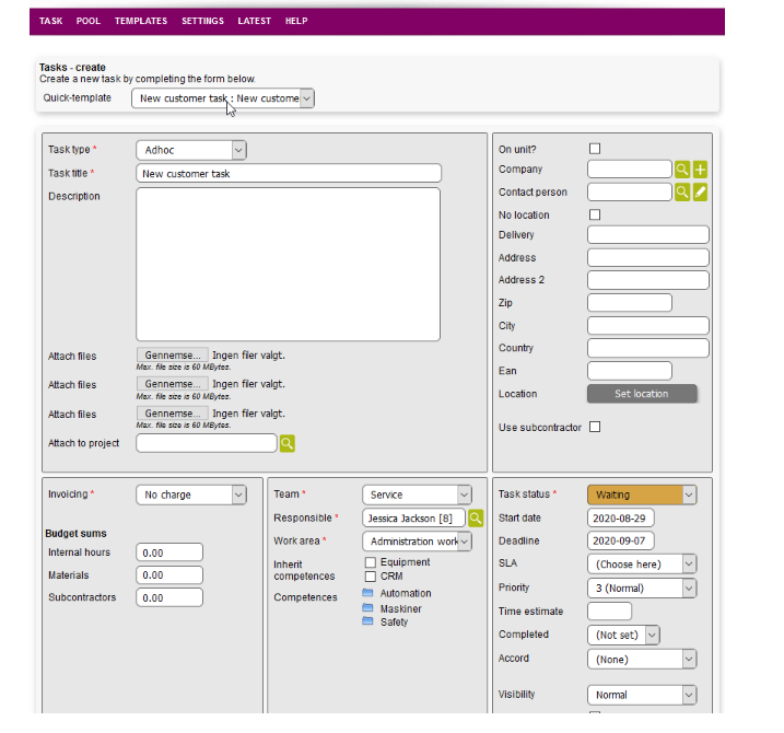 Contact person: Here you can choose a contact person for the task; this is typically a person at the associated company