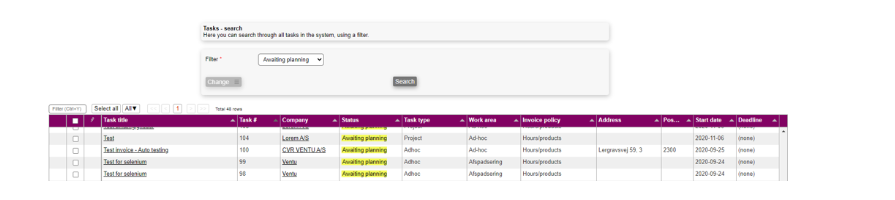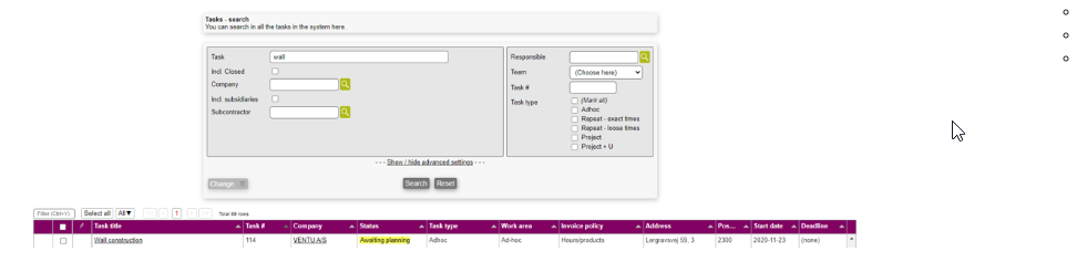 As with many other modules in Microbizz you can search for the specific objects within the module - in this case task objects.