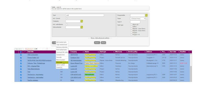 Plan a route for the selected tasks. For more on the subject of routes, please refer to the Planning module