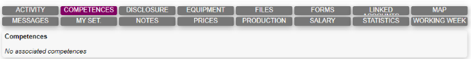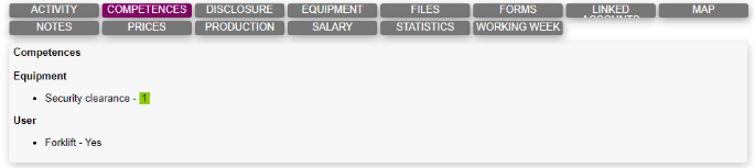 The competences tab shows a list of competences a particular user, task, company and/or equipment has.