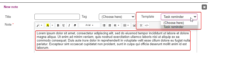 You may pre-fill the note from a template; templates are created in SYSTEM > NOTES > TEMPLATES.