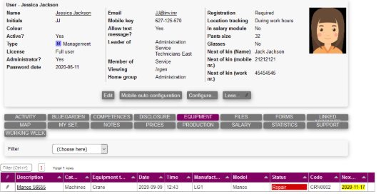 Equipment The equipment tab on the user module shows equipment that is taken by a user. Equipment take/put down, is explained in this section.